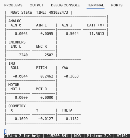 sudo minicom -D /dev/mbot_debug -b 115200You should see output like this: