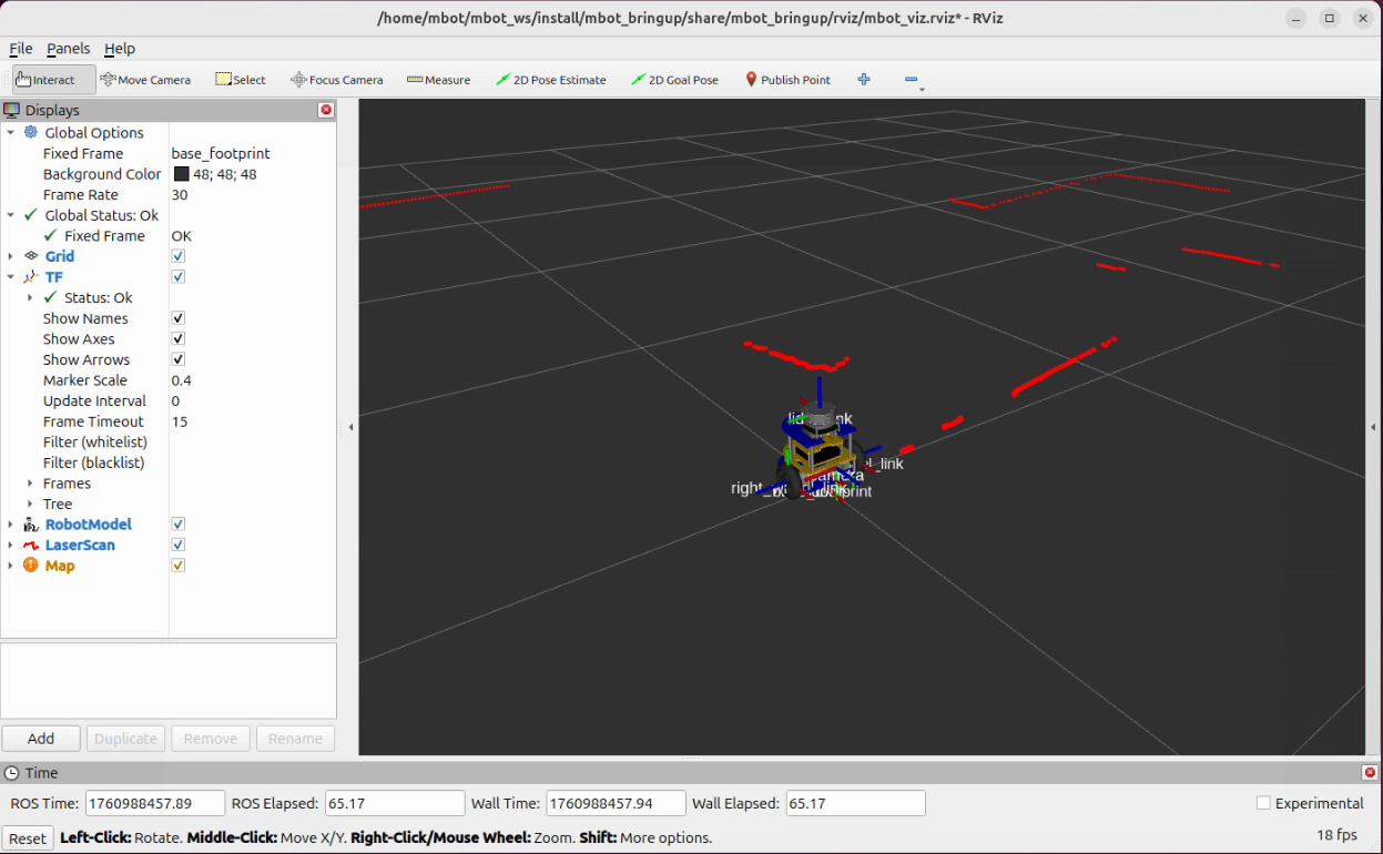 ros2 launch mbot_bringup mbot_viz.launch.pyYou should see the RViz open up with the robot model and the LiDAR scan show up. And if you look closely, the lidar scan is actually “floating”, because it is shooting out from the lidar frame.
